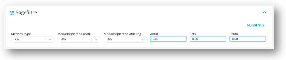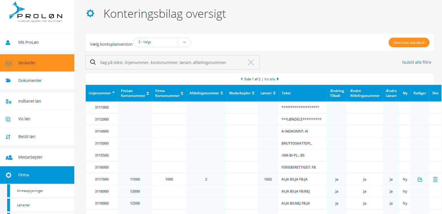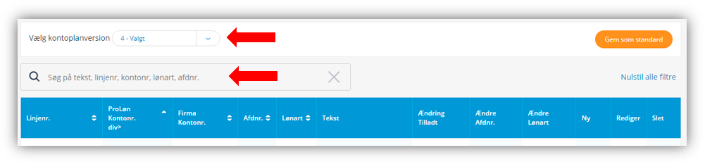 I den blå linje har man mulighed for at filtrere på linje-nr., DataLøn Branche Konto-nr., Firma Konto-nr., Afd.nr. og Lønart.