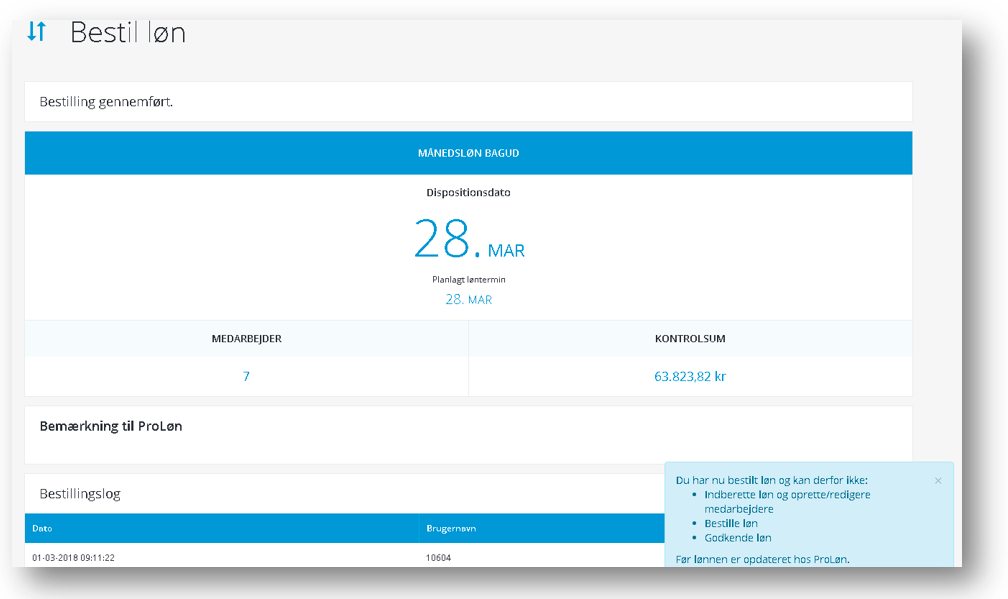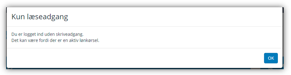 Hvis man får denne besked, kan man ikke indberette løn, oprette/redigere medarbejdere eller bestille endnu en løn. Der er dog stadig læseadgang samt fuld adgang til ProArkiv og til alle håndbøgerne.