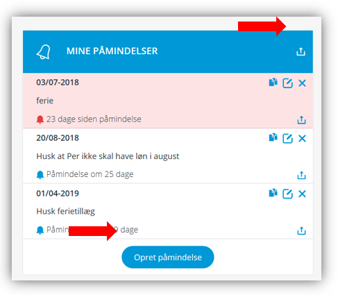 Rediger/slet: En oprettet reminder kan nemt rettes ved at klikke på ”papiret med blyant”, og den kan slettes ved at klikke på krydset.