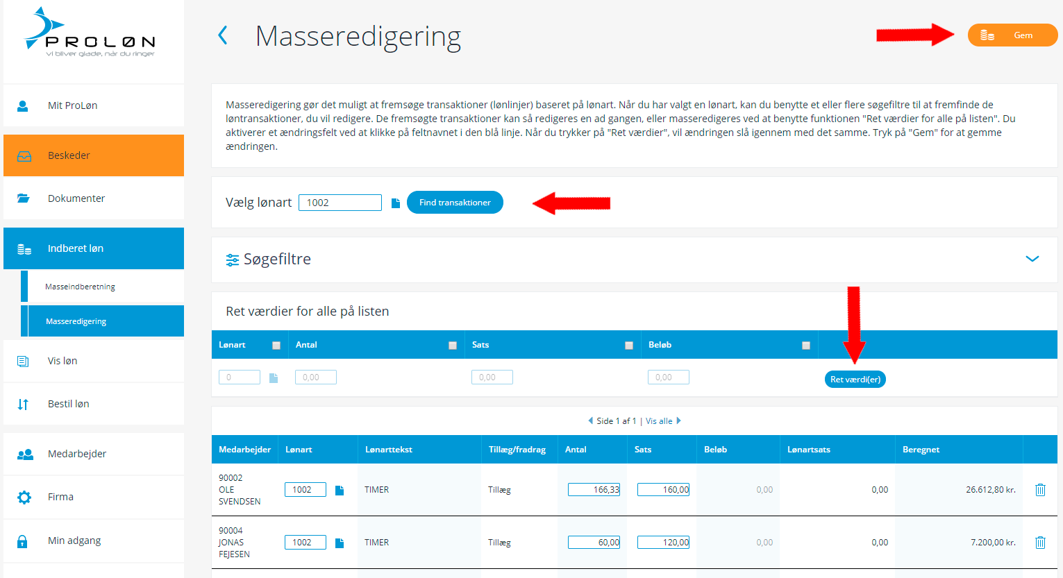 Liste med medarbejdere, der har den søgte lønart fremkommer. Ret værdier for alle på listen.