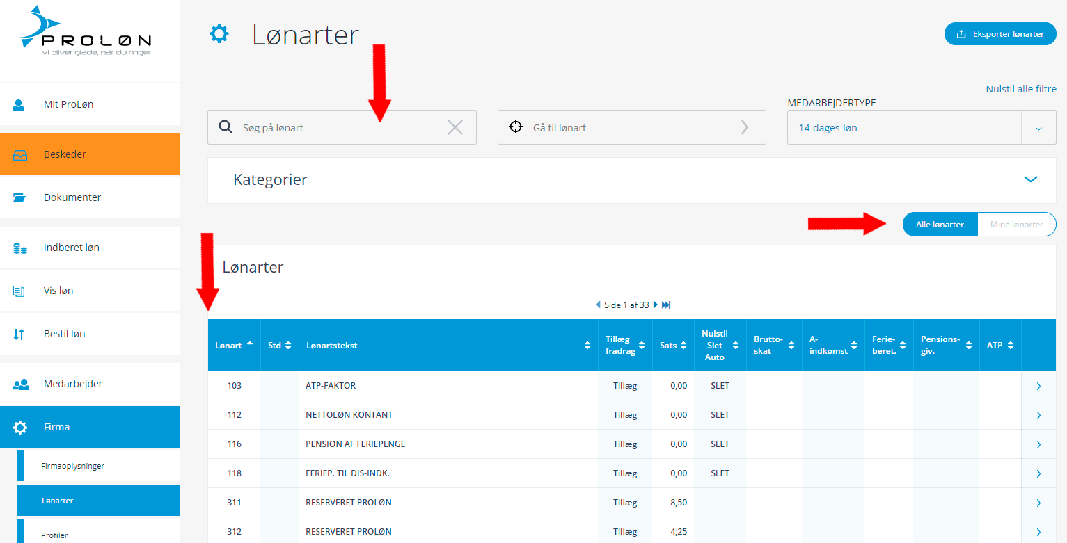 Under ”Mine lønarter” finder man de lønarter, der er brugt på virksomheden og under ”Alle lønarter” kan man søge blandt alle lønarter.