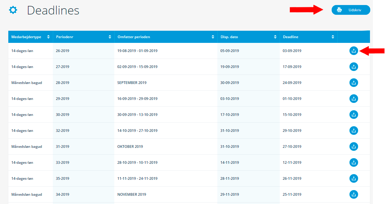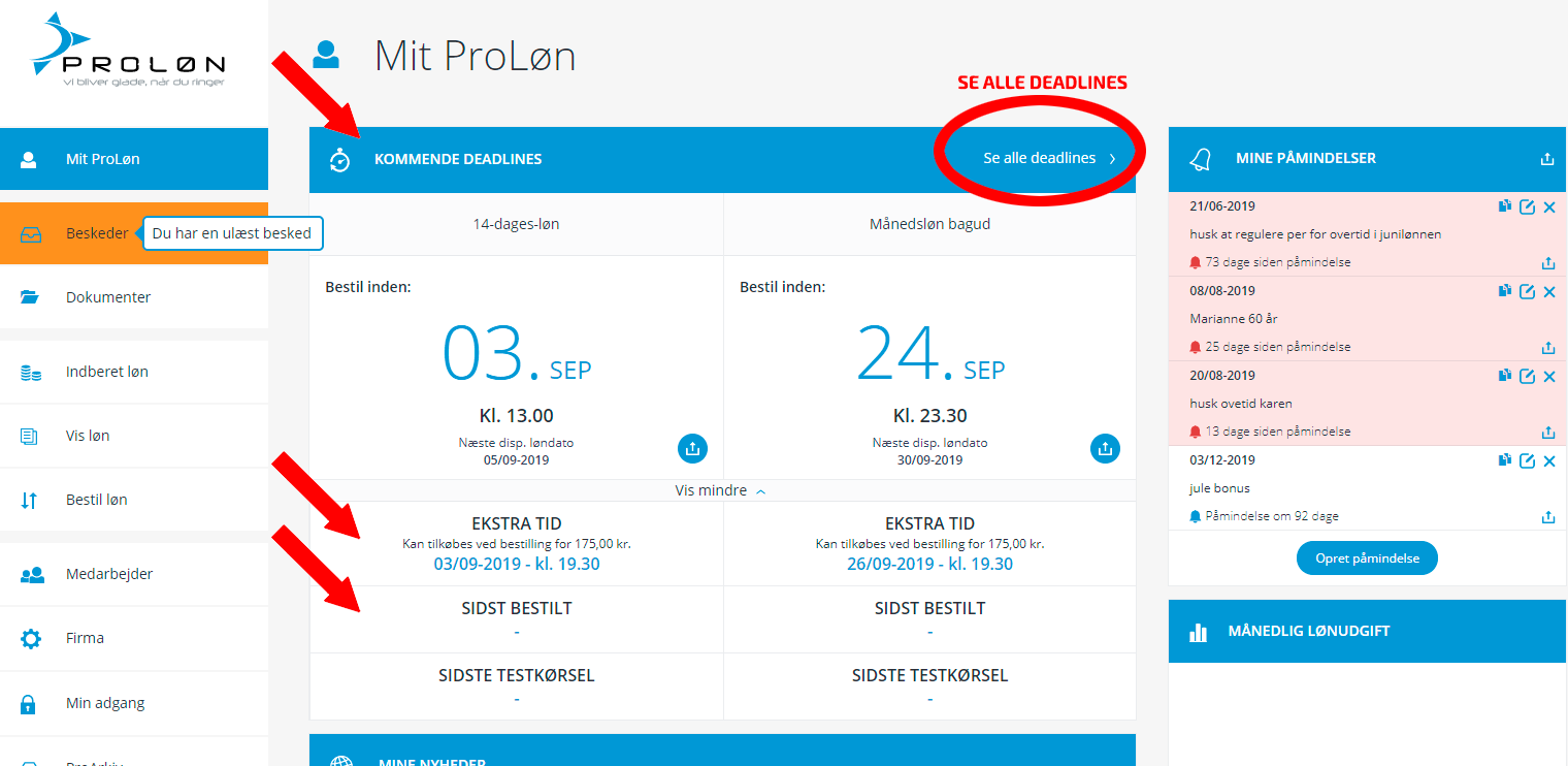 • Kommende deadlines for lønindberetning. Hvis du har flere medarbejdertyper (14-dags-, måneds-, forud eller bagud-lønnede) vil der stå flere deadlines