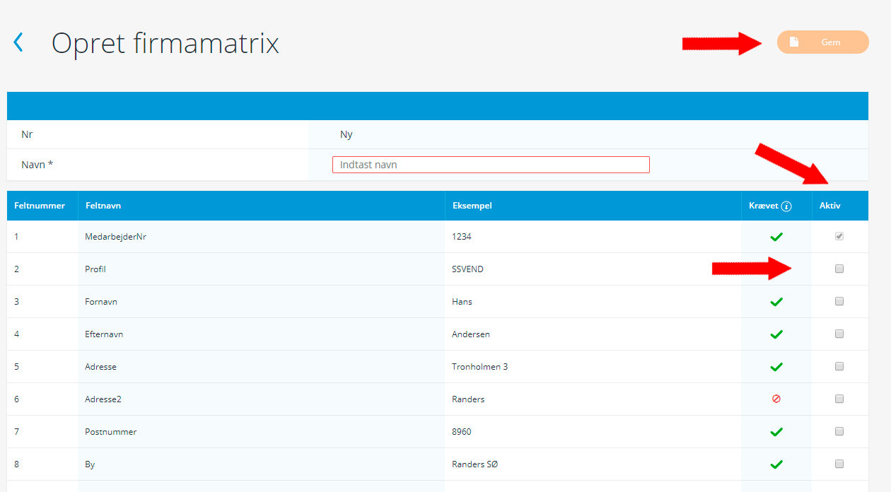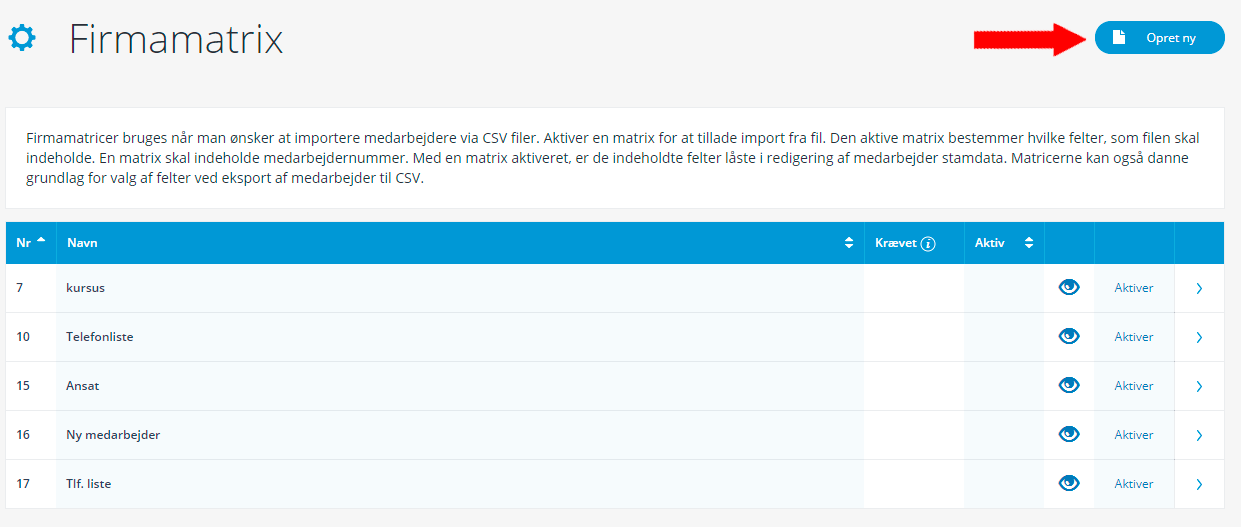 Klik på ”Aktiv”, herefter kan man indlæse sine medarbejdere. Hvis man klikker på ”øjet” kan man se de valgte felter, for den enkelte matrix.