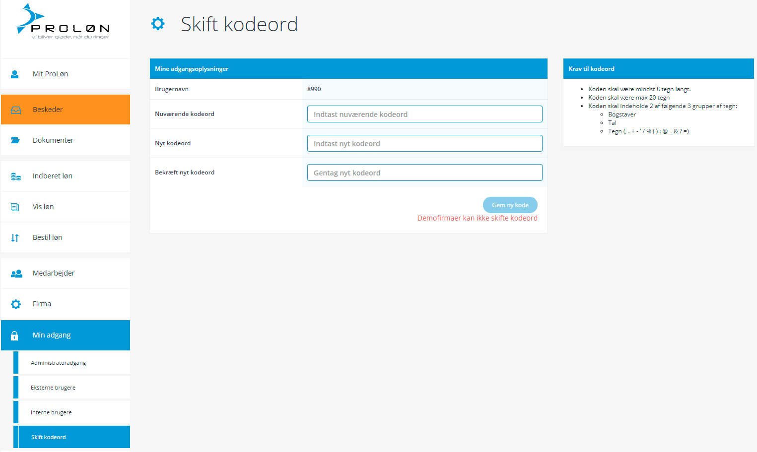 Man har her mulighed for at skifte kodeord. Koden skal være mindst 8 tegn langt. Koden må max være 20 tegn og den skal indeholde 2 af følgende 3 grupper af tegn: