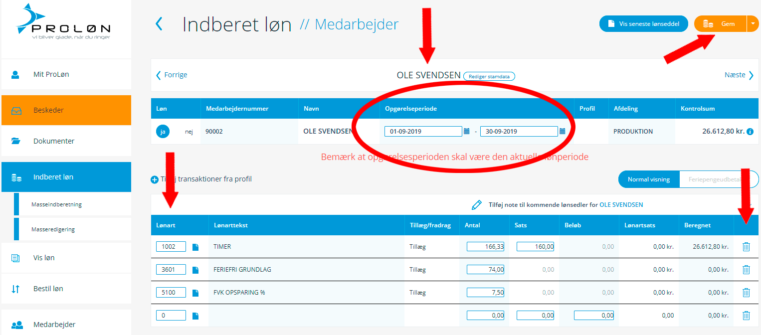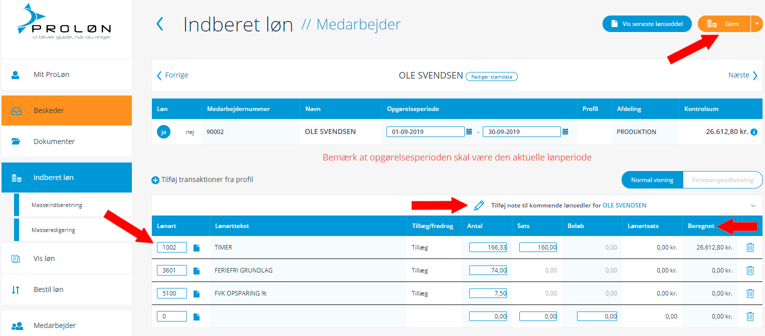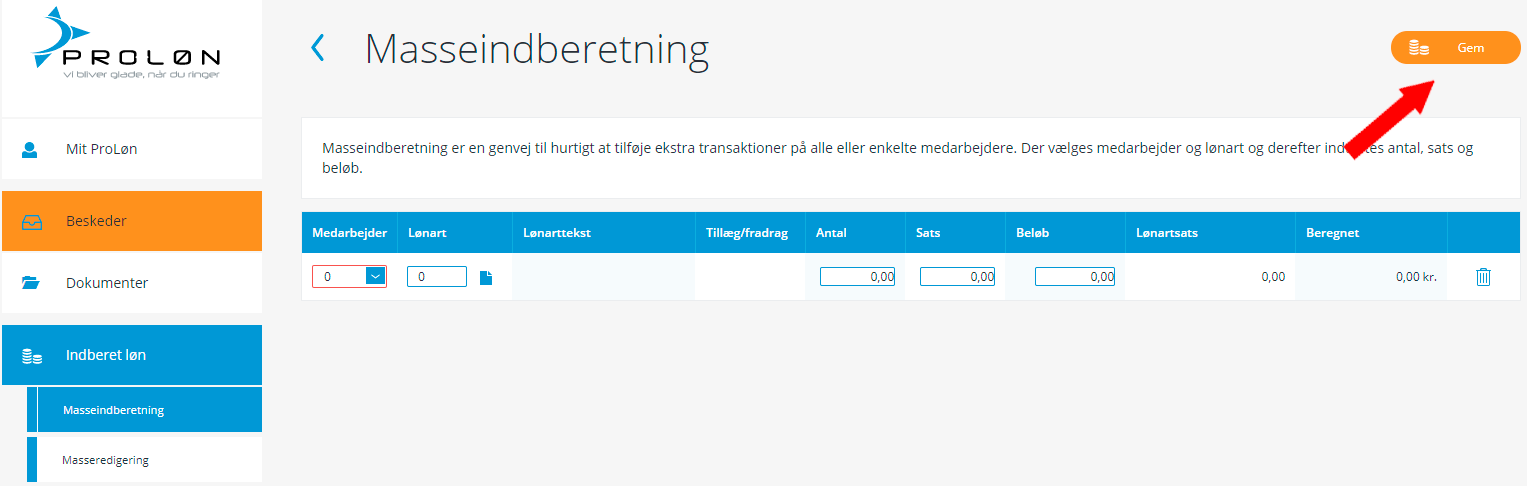 Den beregner løbende de transaktioner, der indtastes og når der trykkes på ”gem” overføres de indtastede transaktioner til ”Indberet løn” på den enkelte medarbejder.