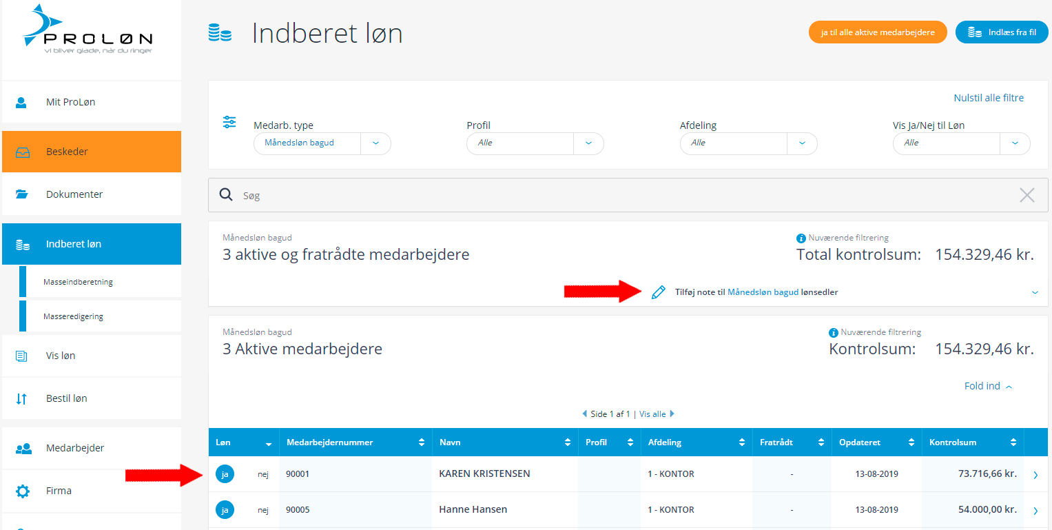Klik på ”ja” ud for de medarbejdere, der skal med i lønkørslen.