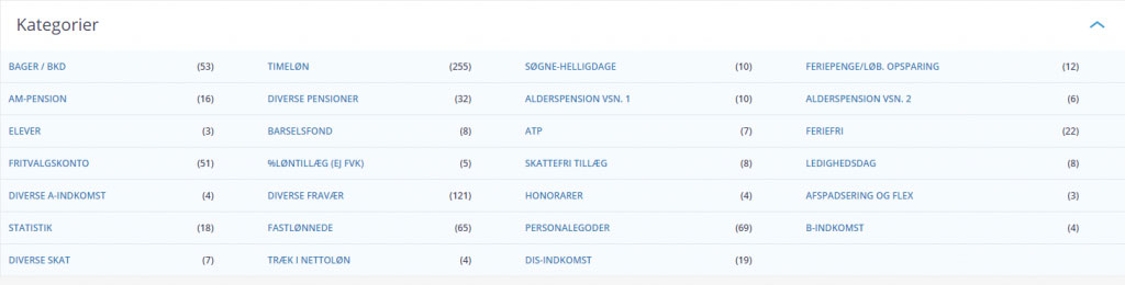 Hvis der er et ”flueben” ud for Bruttoskat, A-indkomst, Ferieberettet løn, Pensionsgivende løn eller ATP betyder det, at lønarten indgår i beregningen for den enkelte kategori, man kan ikke ændre i denne opsætning.