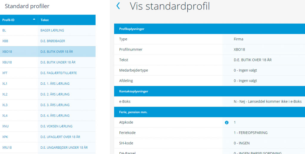 Ved klik på ”Profil” på den enkelte linje ved standard, kan man se hvilke koder og lønarter, der er tilknyttet denne profil.